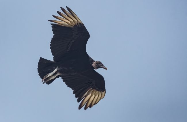 Black Vultures, on the other hand, have dark gray or black heads and shorter tails. Their wings are mostly black except for white patches at the wingtips - like they dipped their fingers in paint! They soar in flatter circles and often follow Turkey Vultures to find food, since they don’t have much of a sense of smell.