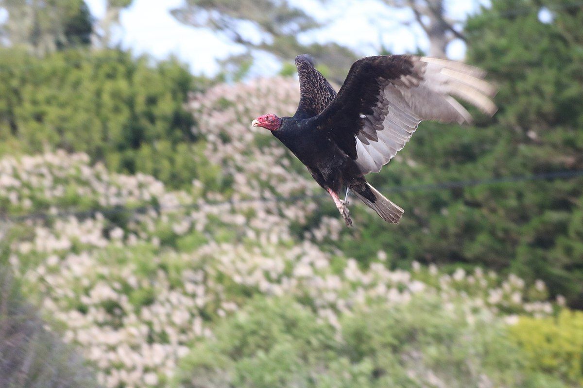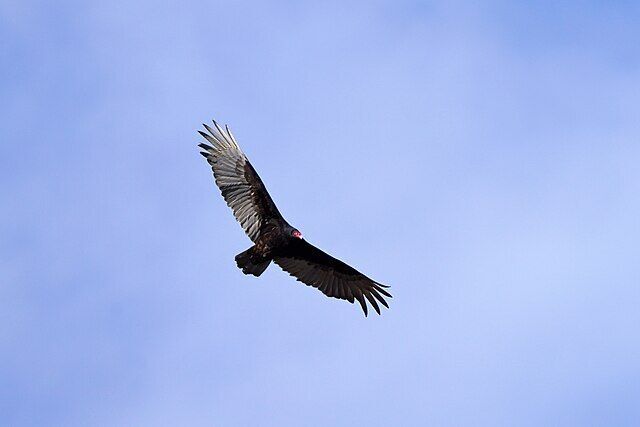 Turkey Vultures are a little larger and have red, featherless heads (like a turkey’s!). When they’re flying, you’ll notice their wings form a gentle “V” shape, and the feathers along the edges are silvery gray, making them easy to spot against the sky. Turkey Vultures also wobble slightly as they soar and rely on their strong sense of smell to find food.